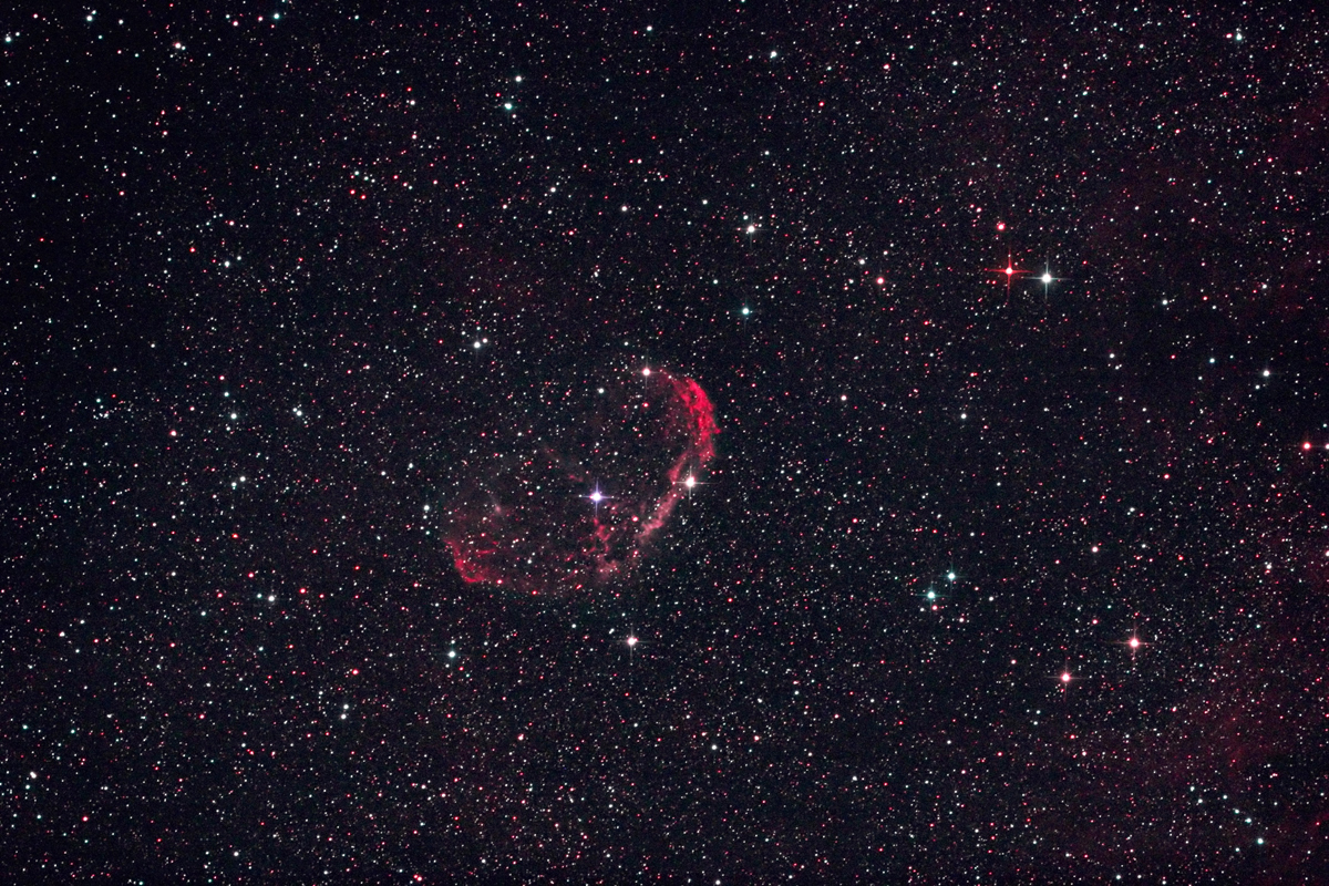 Ionisierungsprozess. Visuell ist der Nebel am besten mit einem Nebelfilter (UHC oder O-III) zu erkennen. Bei schwacher Vergrößerung zeigt sich der Nebel als großer Bogen. Durch die Verwendung eines UHC Filters sind die reinen blauen Anteile des Nebels etwas geschluckt worden. Trotzdem kann man gut erkennen, daß der Nebel nicht nur im H-Alpha Bereich leuchtet. Daten zum Nebel: Crescent Nebel - NGC 6888 Größe: 18min x 13 min RA 20h 12m - Dec + 38° 21´ |