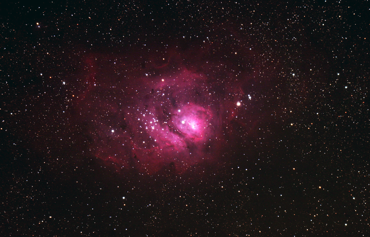 | Lagunen Nebel - M8 ein prachtvoller Emissionsnebel mit eingelagerten bläulichen Strukturen. Dem Emissionsnebel vorgelagert ist der offene Sternhaufen NGC 6530. Die visuelle Helligkeit des Nebels beträgt 6,1Mag und die Ausdehnung beläuft sich auf 90x40 Bogenminuten. Durch seine niedrige Deklination von -24° 23´ ist der Nebel aber in unseren Breiten nur in sehr klaren Nächten ein befriedigendes Objekt. Der Lagunen Nebel ist ein schönes Objekt für Ferngläser. Wenn man den Nebel durch ein Teleskop betrachtet, sollte man eine möglichst niedrige Vergrößerung wählen. Der hellste Bereich des Nebels ist der "Stundenglas" Nebel. Er ist mitten im hellsten Nebelbereich und relativ klein. Bei genauem Hinschauen zeigt auch diese Aufnahme die typische Form des Stundenglases. |