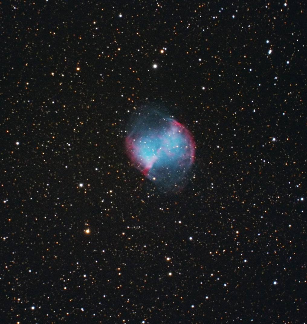 Hantelform. Die scheinbare Helligkeit ist 7,3 Mag und er hat eine Ausdehnung von 8,0 x 5,7 Bogenminuten. Der Zentralstern ist ein weißer Zwerg mit 13,94 Mag Helligkeit, er ist auf der Aufnahme gut zu sehen. Die Entfernung des Nebels ist ca. 980 Lichtjahre. |