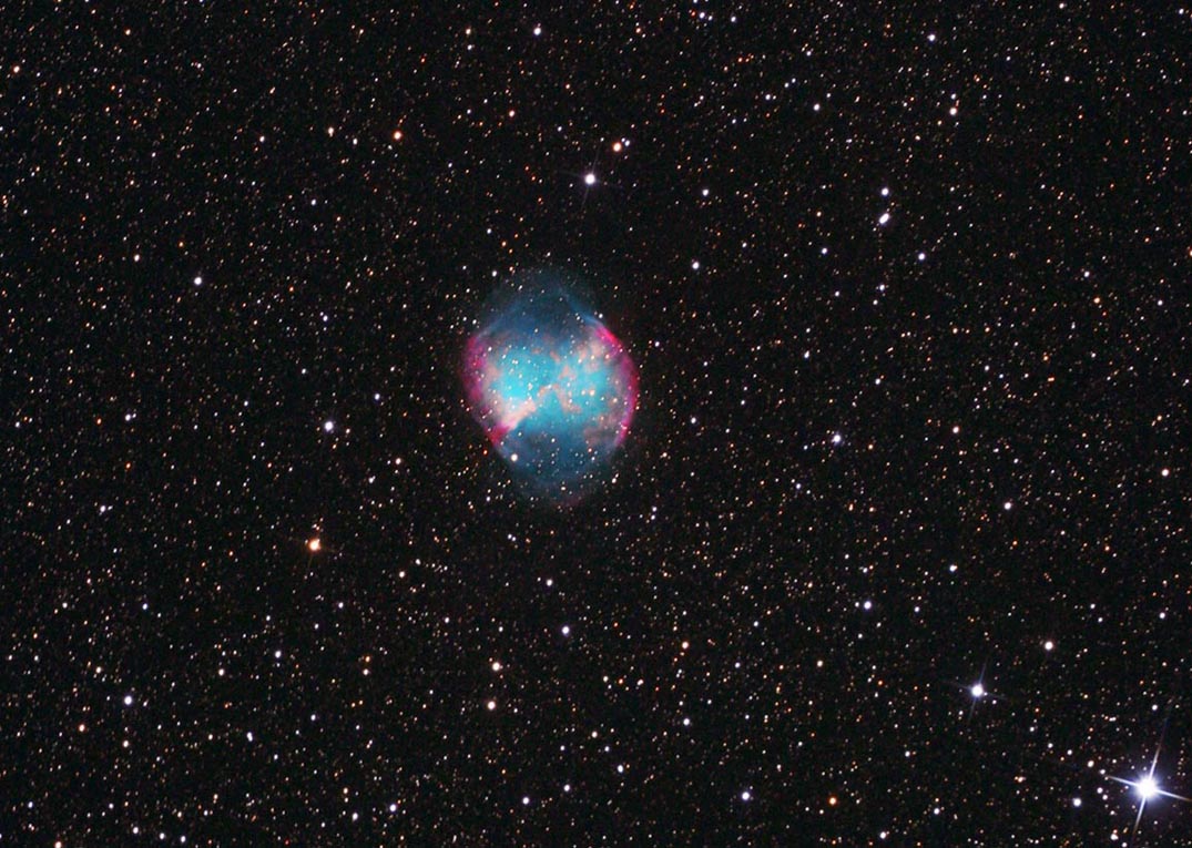 uns entfernt ist. Der Nebel ist die Gashülle eines Riesensterns, der in einer Nova vergangen ist. Dieses Ereignis hat vor 3-4000 Jahren stattgefunden. Die Hülle dehnt sich noch immer aus, der Nebel besitzt jetzt bereits einen Durchmesser von etwa 2 Lichtjahren. Objektdaten: Die scheinbare Helligkeit ist 7,3 Mag und er hat eine Ausdehnung von 8,0 x 5,7 Bogenminuten. Coordinaten: Rektaszension 19h 59m 36s Deklination +22°43´ |
