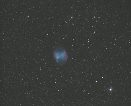 Hantelform. Der Ursprung des Nebels ist ein weißer Zwerg mit ca. 14 Mag.