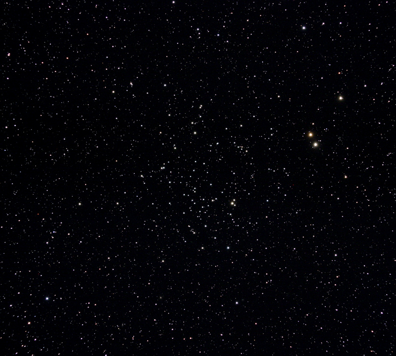 Besteht aus etwa 60 Sternen Der Sternhaufen ist ein schönes Fernglasobjekt und bildet mit M-33 und M-31 ein Dreieck. In guten Nächten ist der Sternhaufen sogar schon mit dem bloßen Auge zu sehen. Schön sind auch die schwachen Galaxien, die hinter dem Nebel sichtbar sind - Aufnahmen etwas weiter unten. |