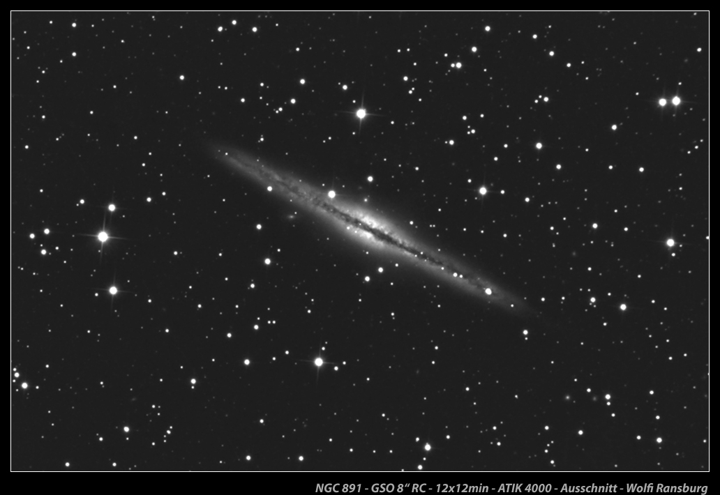 NGC 891 ist eine der bekanntesten Galaxien und steht, zumindest fotografisch, den bekannteren Galaxien, wie M31 oder M33 in nichts nach, bis auf die Größe. Das macht die Galaxie aber durch ihre exklusive Lage wett. Durch die Kantenlage sind sehr gut die Staubbänder sichtbar. Die Galaxie ist, fotografisch gesehen, sicher eines der begehrtesten Objekte, selbst mit kleinen Öffnungen zeigt 891 bereits Strukturen. Auch visuell ist die Galaxie sehr schön, ab 10" Öffnung kann, unter guten Bedingungen, bereits das zentrale Staubband erkannt werden. NGC 891 ist in einer Region mit hoher Galaxiendichte, wobei die meisten
