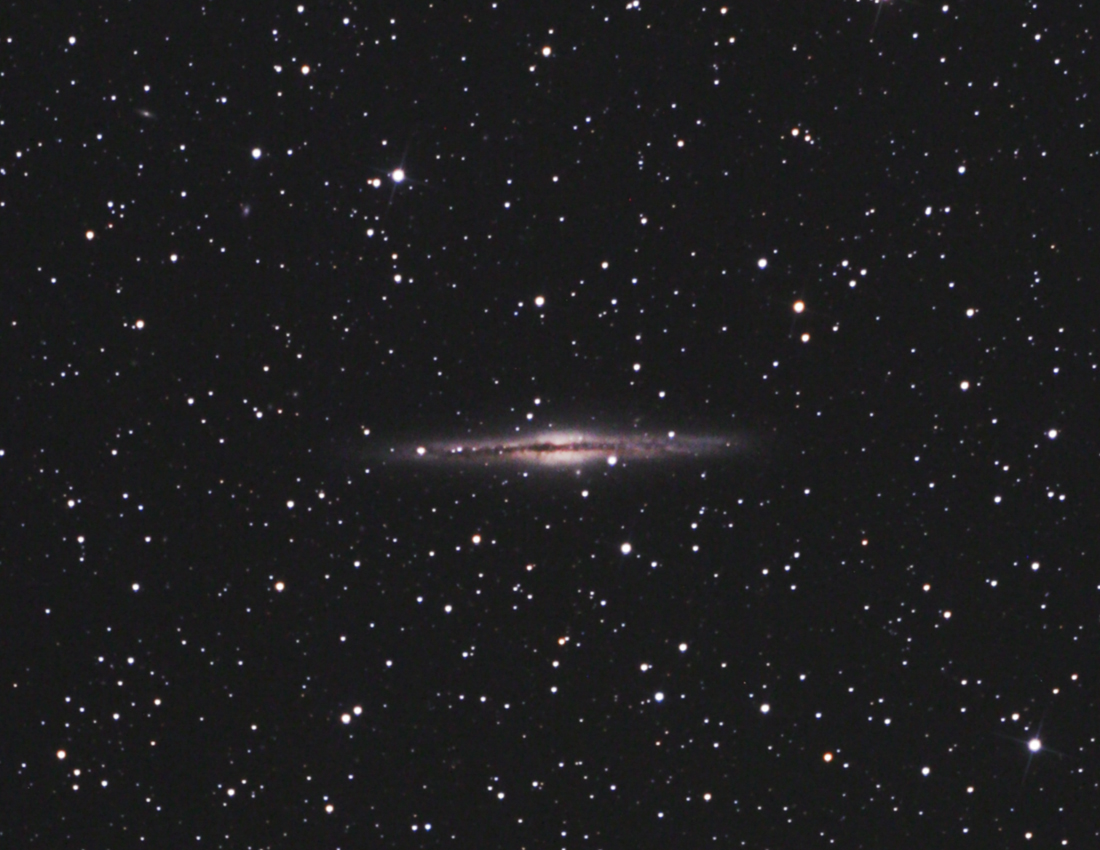 Vergrößerung von NGC 891 - gut sind bereits die rötlichen Einlagerungen und die bläulichen Randregionen erkennbar. |