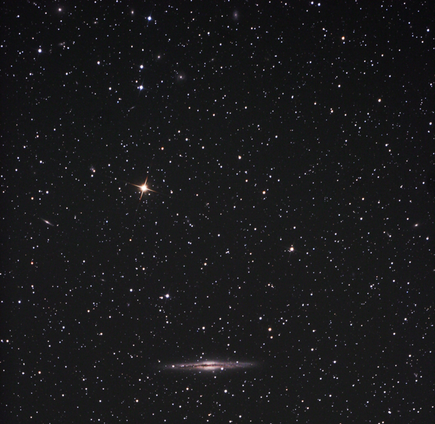 NGC 891 in Feld - bei genauem Hinsehen erkennt man bereits auf dieser schwach vergrößerten Aufnahme viele Galaxien. Die untere Hälfte der Aufnahme wurde abgeschnitten. |