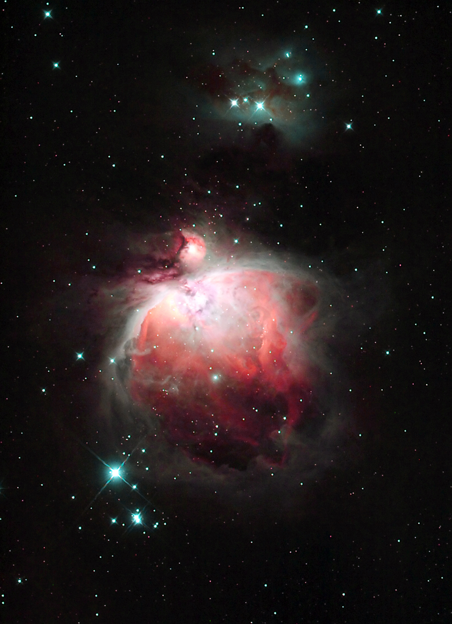 Link zu Aufnahmen von Protosternen mit dem Hubble Space Teleskop ) Auf dieser Aufnahme kann man gut die tatsächliche Position des Nebels und seine scheinbare Größe im Sternbild Orion sehen. ( Link zu einer Übersichtsaufnahme ) Für Hobby Astrofotografen ist der Nebel eine besondere Herausforderung, während das Zentrum sehr hell ist, sind die Randregionen eher schwach. Die Herausforderung ist, zu versuchen, möglichst viele Details im Zentrum des Nebels abzubilden, ohne zu viel von den Randregionen zu verlieren. Auf vielen Amateur Aufnahmen ist deshalb das Zentrum des Nebels ausgebrannt. |