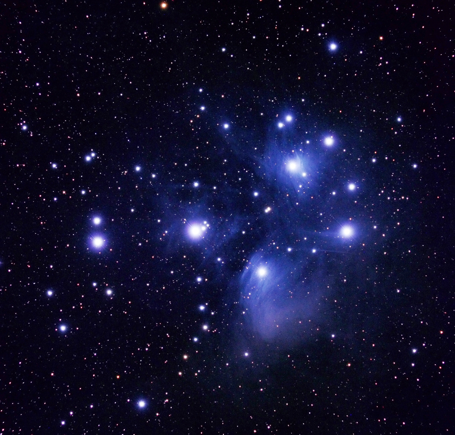 Brennweite kann der Sternhaufen sehr gut beobachtet werden. Erst recht lichtstarke Teleskope und natürlich die Astrofotografie zeigt, daß die relativ jungen Sterne in Nebelmassen, aus denen sie entstanden sind, eingebettet sind. Die blauen Reflexionsnebel offenbaren reiche Strukturen. Die Abbildung zeigt die Plejaden mit voller Auflösung |