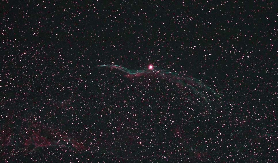 unteren Ende der Aufnahme) und aus dem Strumvogel. Größere Öffnungen zeigen auch visuell sehr schön die balkenförmigen Querverbindungen der helleren Regionen des Strumvogels ( auf der Aufnahme links von 52 Cyg ). Der helle Stern 52 Cygni hilft dabei beim Auffinden. Es ist der Stern in der Mitte der Aufnahme. So einfach er das Auffinden macht, bei der Beobachtung der schwachen Nebelstrukturen, die sich etwa von Nord nach Süd ziehen, stört er eher. Oft macht es Sinn, den Stern etwas außerhalb des Gesichtsfeldes zu positionieren, um dann ein schwaches Glimmen im Okular wahrzunehmen. Ein UHC Filter oder O-III Filter ist dabei für die Beobachtung sehr sinnvoll. Daten zum Objekt: NGC 6960 RA: 20h 45min 38s - Dek: 30° 42´ 30" |